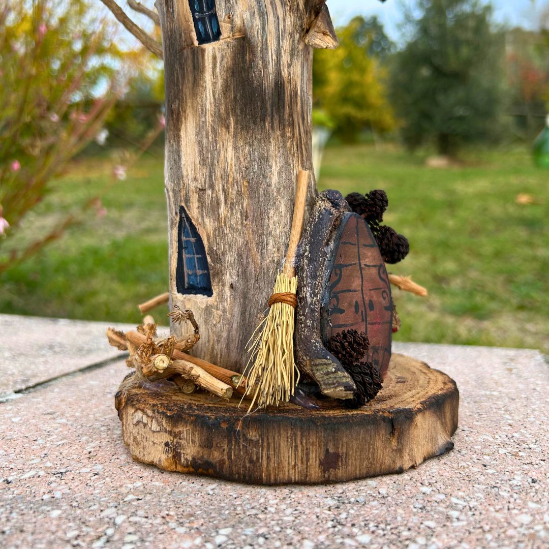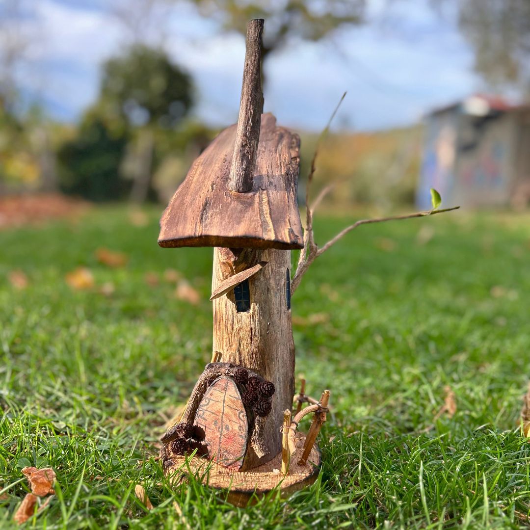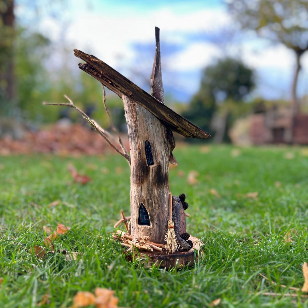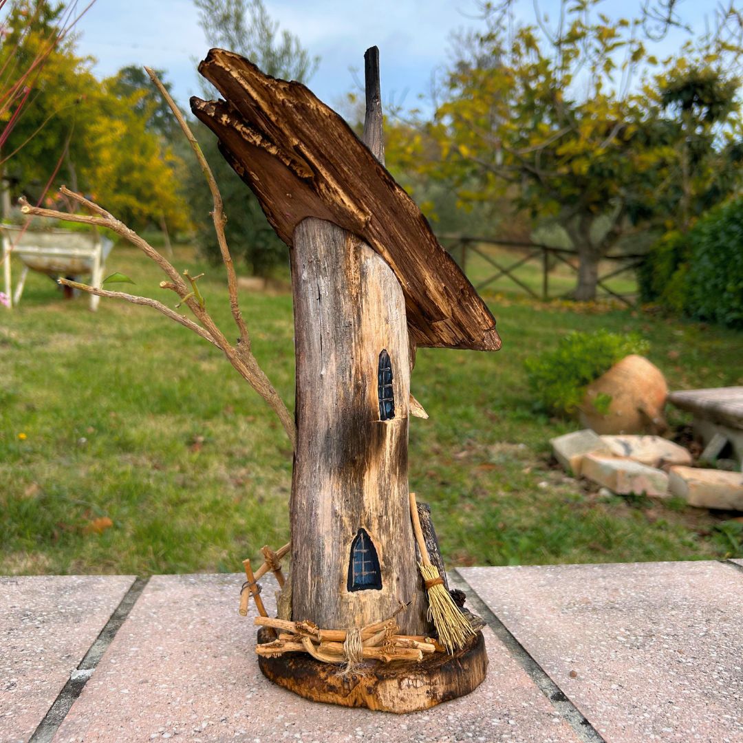 Realizzata interamente a mano e solo con materiali di recupero: dalle finiture naturali alle finestrelle dipinte, fino alla piccola scopa sul portico, ogni accessorio ha avuto un'altra vita e si è qui trasformato.