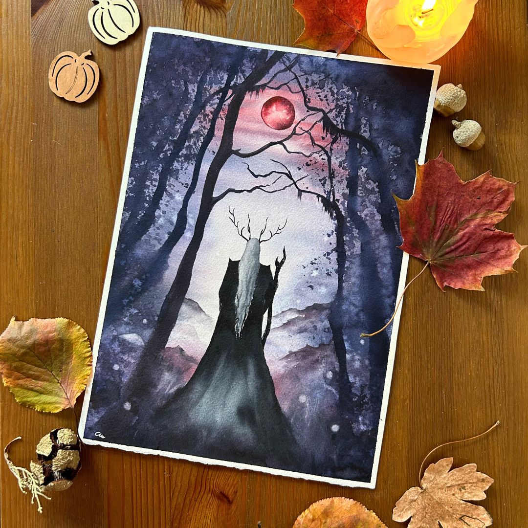 In questa illustrazione misteriosa, quasi sacrale, un druido cammina al chiarore di una luna rossa, custode antico dei segreti della foresta.