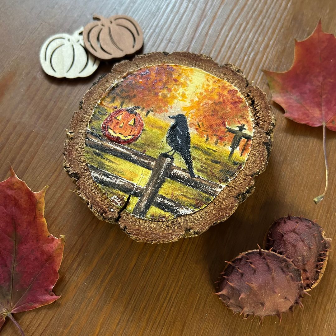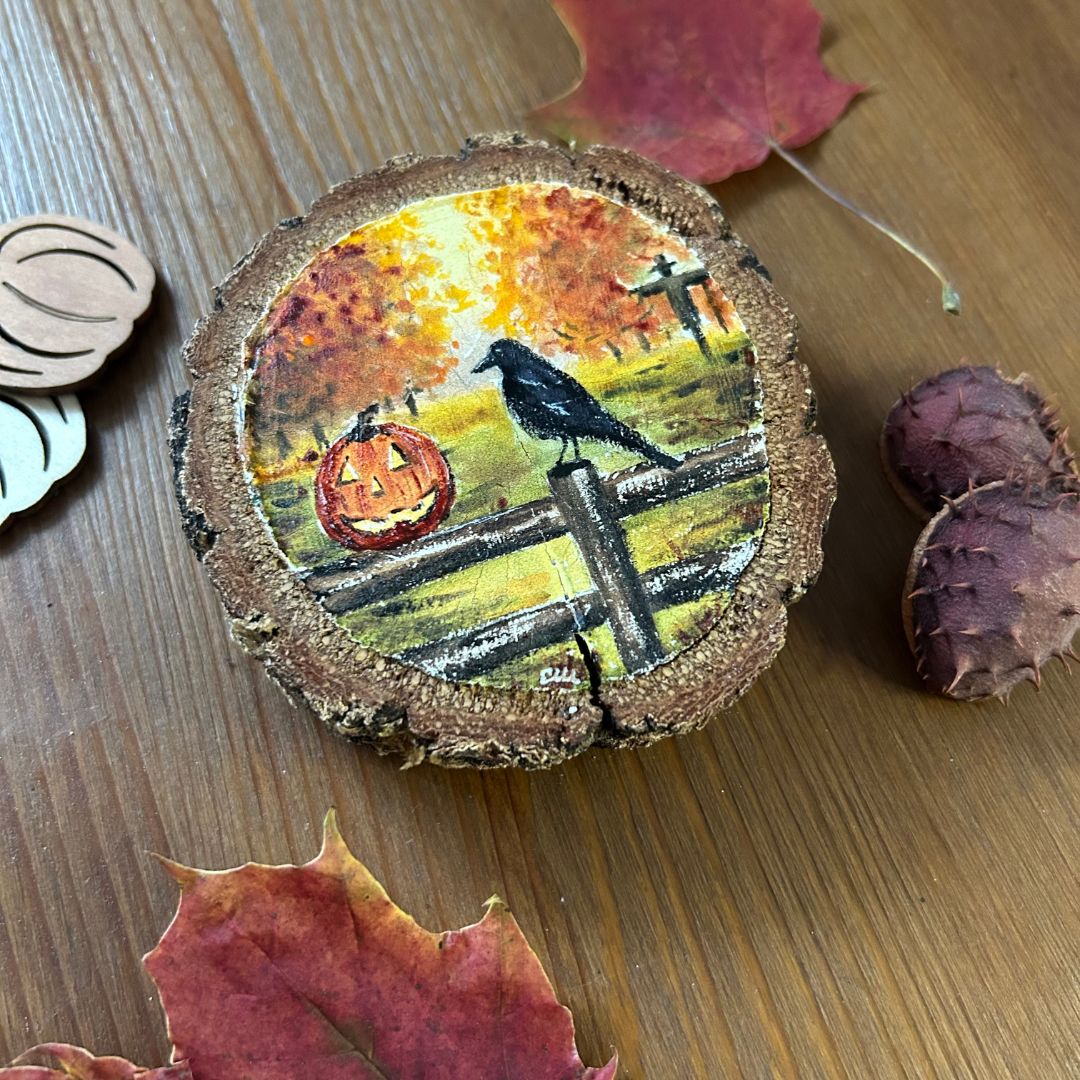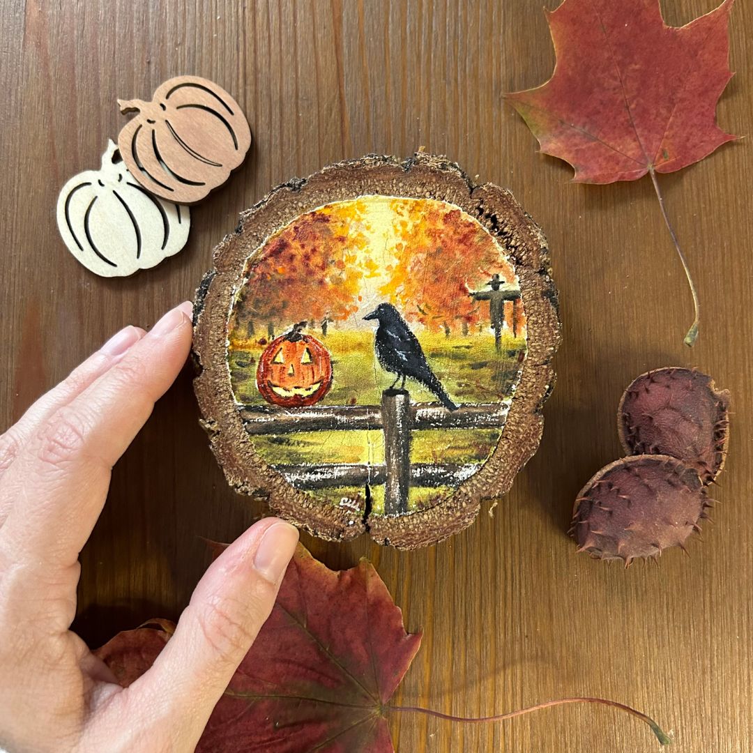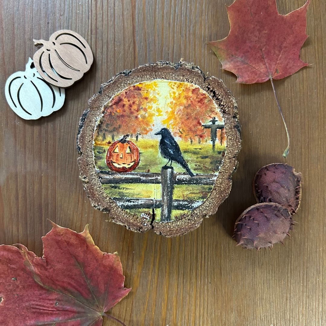 Un piccolo cerchio in legno che racchiude l’atmosfera più suggestiva dell’autunno: sfumature dorate, un corvo misterioso e una zucca appena intagliata. Il legno naturale del supporto si sposa armoniosamente con il soggetto di questo dipinto: un tributo autentico alla natura e all'autunno.