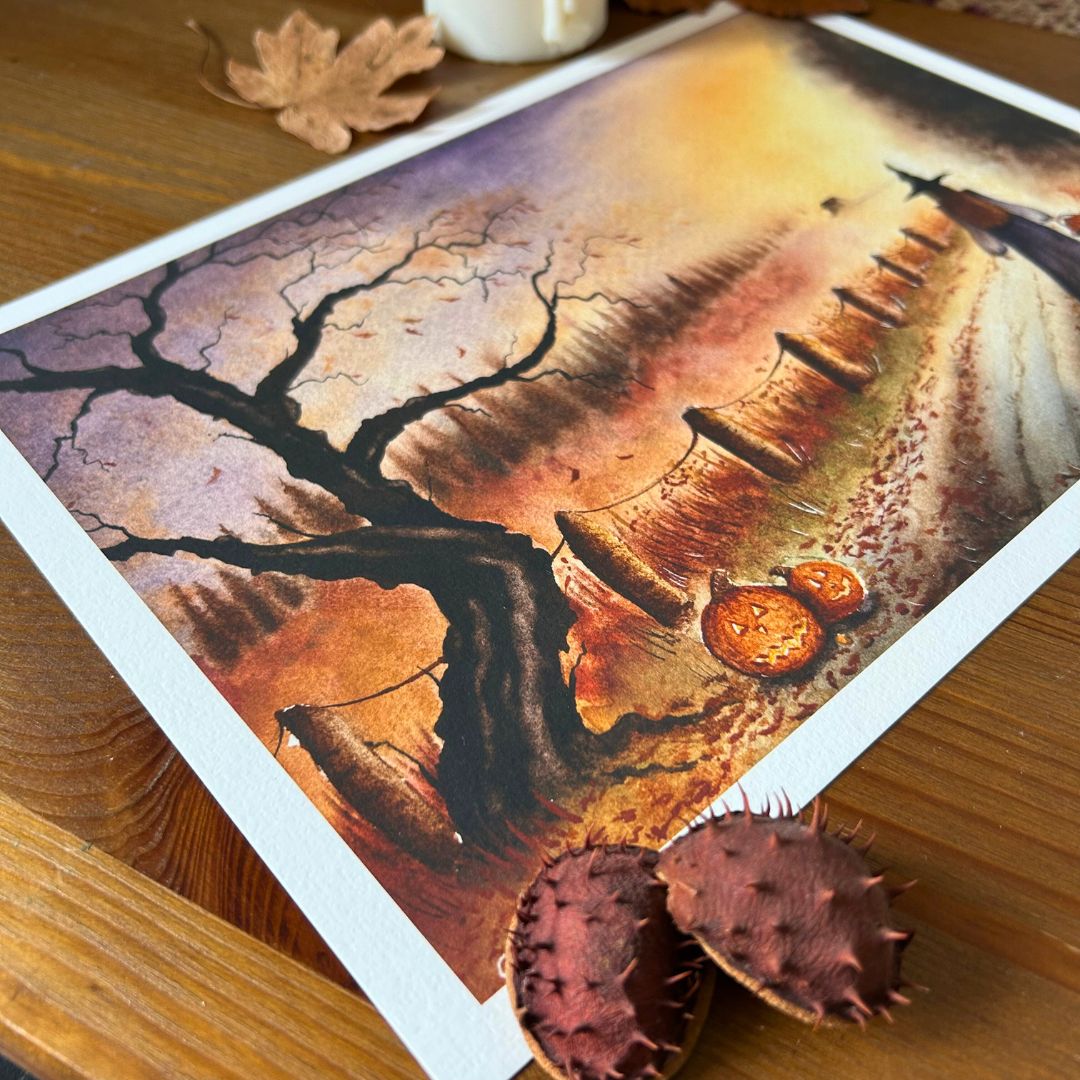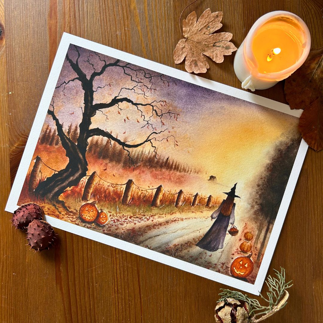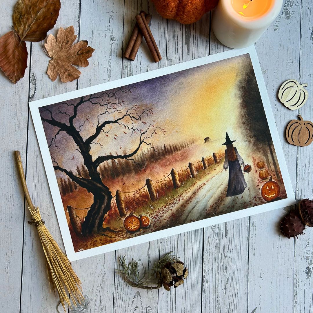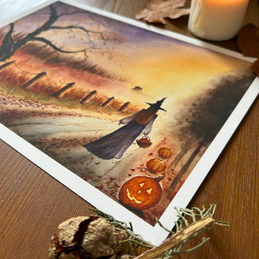 In una fresca sera di Halloween, una strega si gode la via di casa dopo aver raccolto le ultime zucche. Il sole sta tramontando, è ora di prepararsi per le celebrazioni.